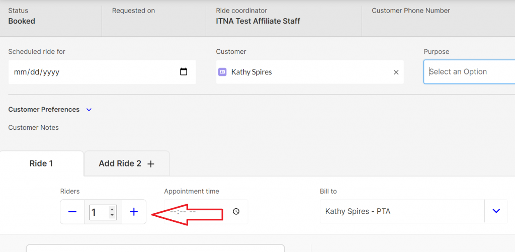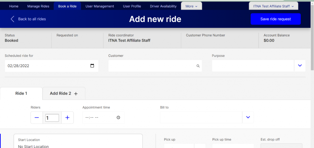 Click the “Book a Ride” tab at the top of the page. This will open the Add New Ride screen.