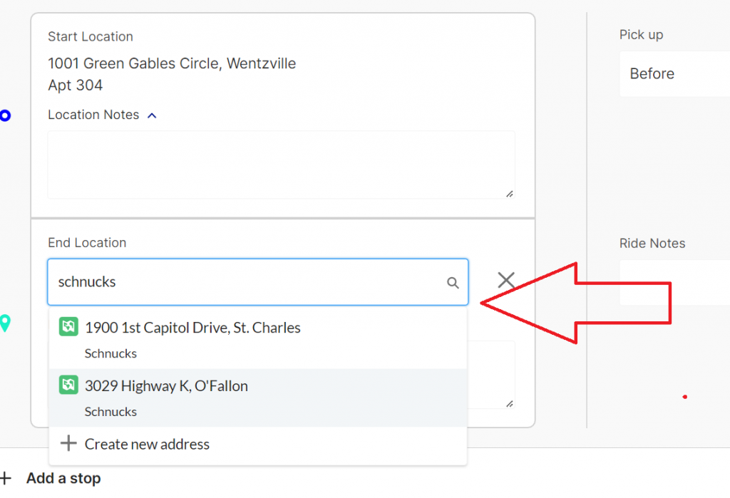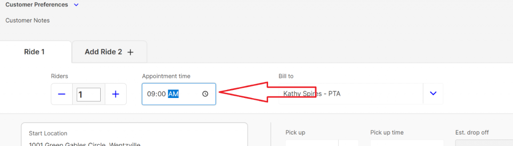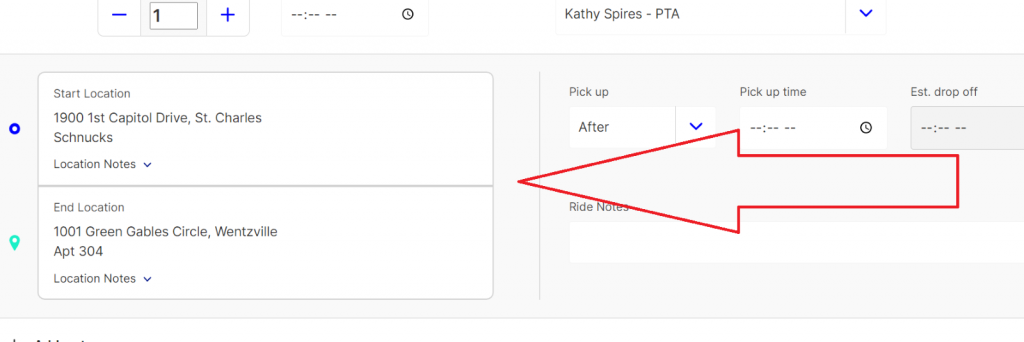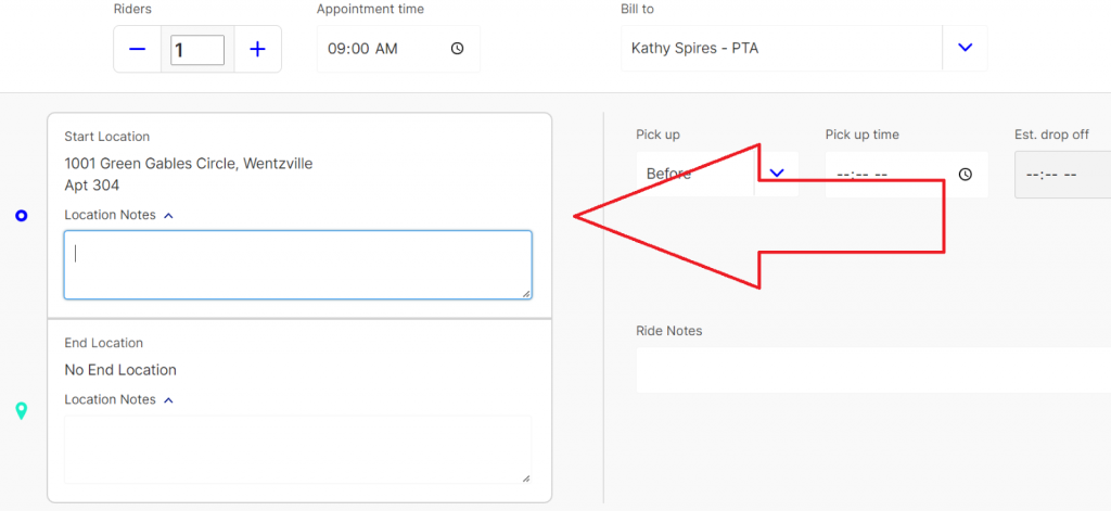 The rider’s home address will be auto-filled in the start location box. Change this if they will be picked up somewhere else.  Enter any notes needed in locations notes. (Example- please go to the side door.)