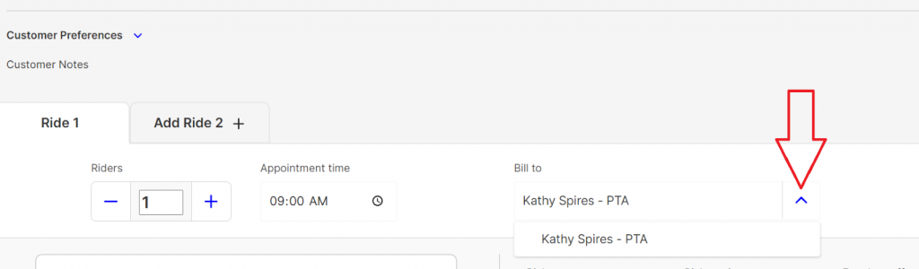 If needed, adjust the Bill To for the ride.  This should only be adjusted if someone other than the rider’s account is billed for the ride. Click on the down arrow to see any other Bill To’s that are connected to the customer’s account.  This is often used for Ride Services accounts.