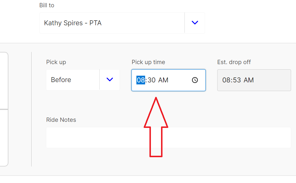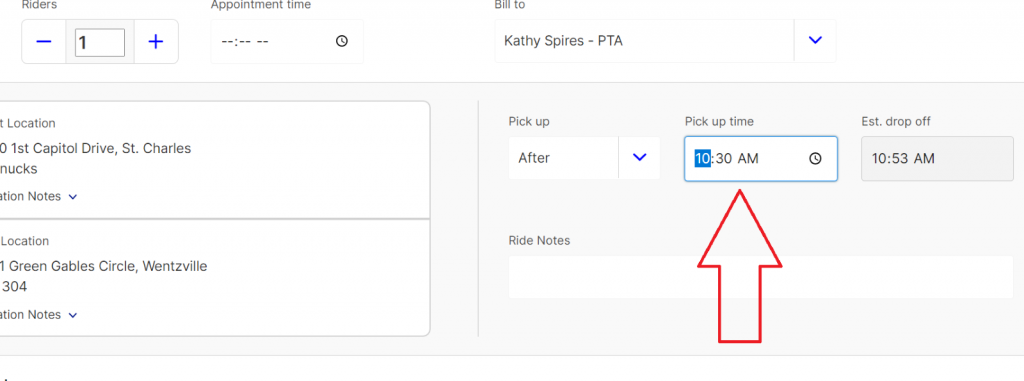 Enter a time in the pick-up time field.  The box to the left will be set to after, leave this as it is. If you are used to typing in military times, you can still do so, but the system will convert it to the 12 hour time, changing it automatically to PM if it is 13-19 for hours. You can also use the arrow buttons to select AM or PM when typing in the time, with up entering AM and down entering PM.   If the rider would prefer an early driver to waiting for pick-up, this can be toggled to “Before”.