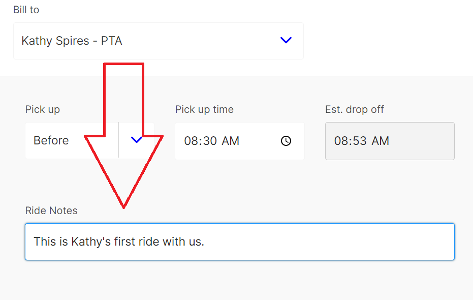 Enter any special notes for the ride. Examples of things that would go in this box:  a note about the appointment the rider is going to, a rider request for the ride (like calling when you arrive).