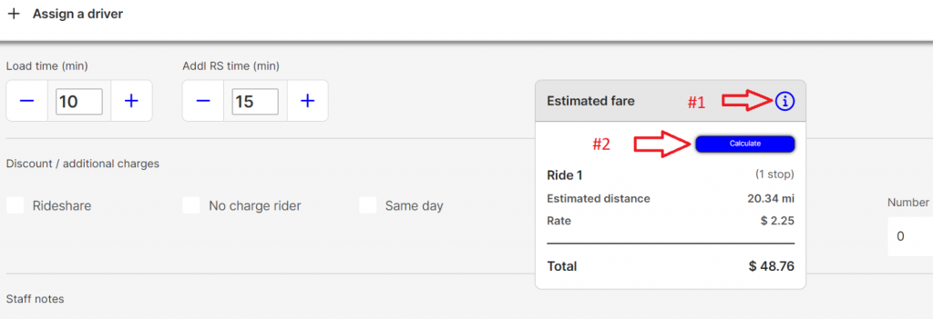 You can see the estimate of the charge for this ride by clicking on the I in the Estimated Fare box. This will open the option, click calculate to see the estimated charge.  Click the I again to close the box.