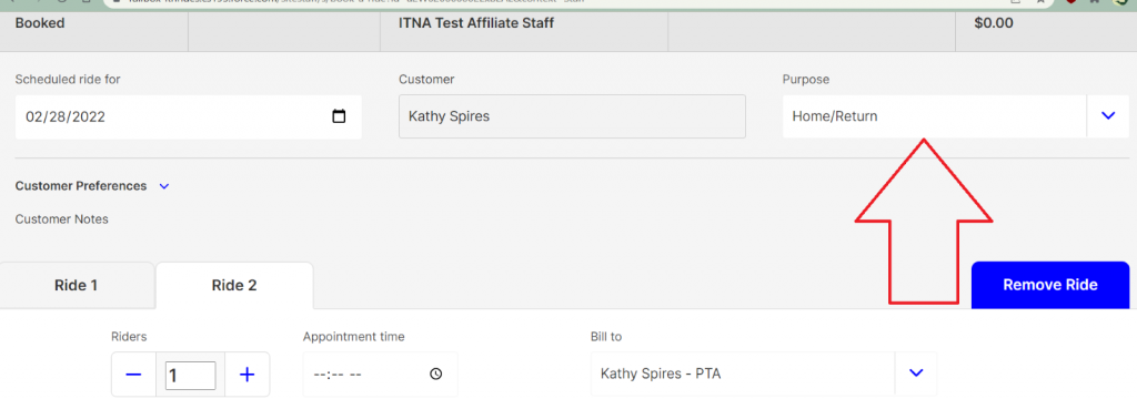 The purpose will auto-fill to “Home/Return”.  Adjust this is the ride purpose is different.