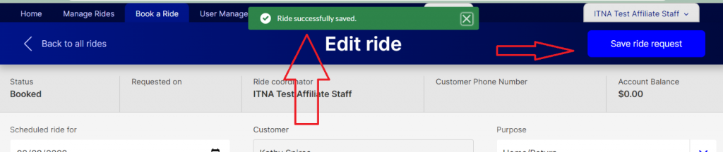 A green box stating “Ride Successfully Saved” will show at the top of the screen.