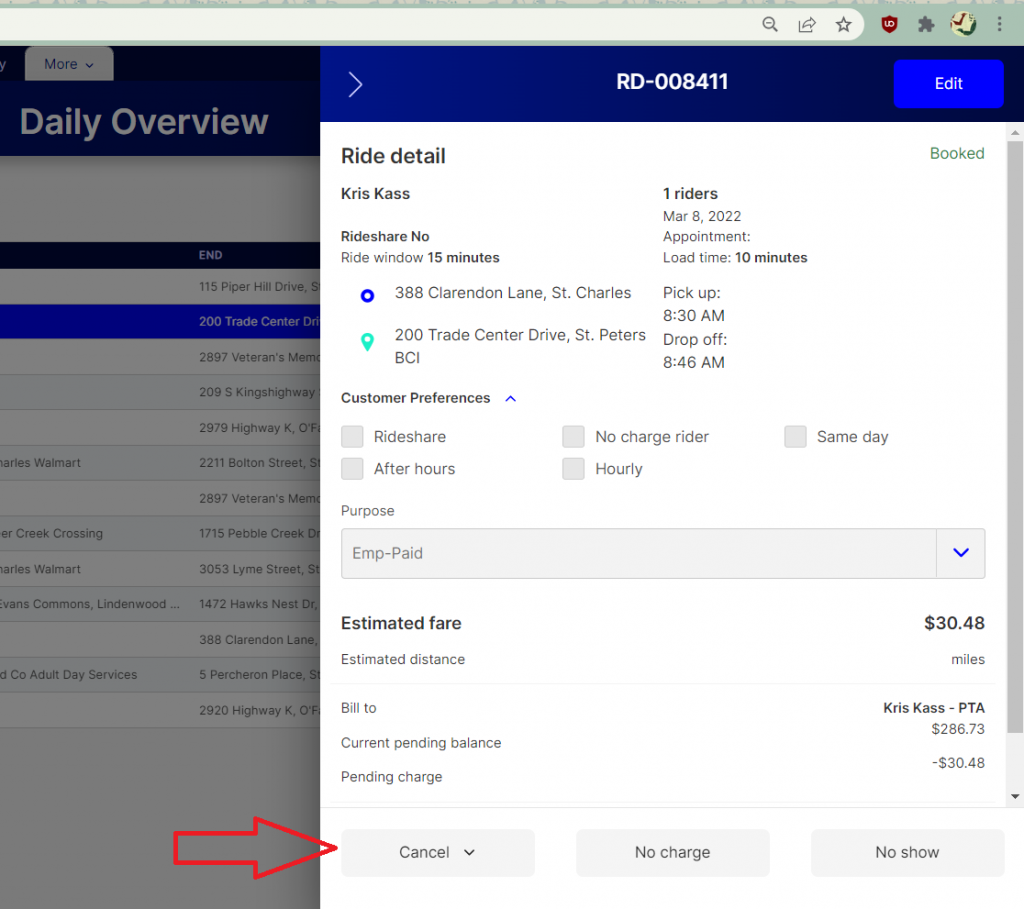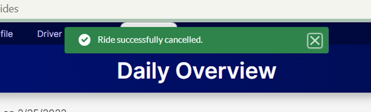 Click confirm cancellation, and a green box will appear showing you that the ride has been successfully cancelled.