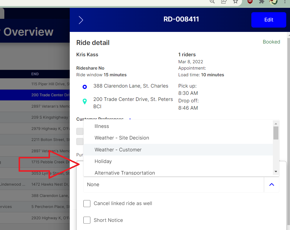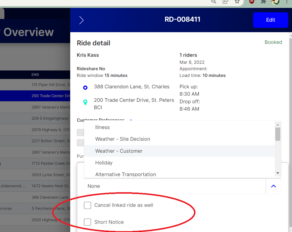 If there is a return ride to cancel as well, be sure to check the “Cancel Linked Ride as Well” option. If you click the “Short Notice” box, the rider will be charged the no show fee, if applicable for your site.