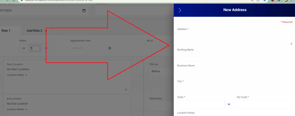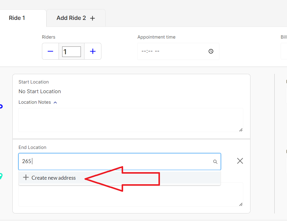 Begin entering an address in the end location box of the ride booking screen, if no match is found in the system you will see “Create New Address” underneath the box you are typing in.