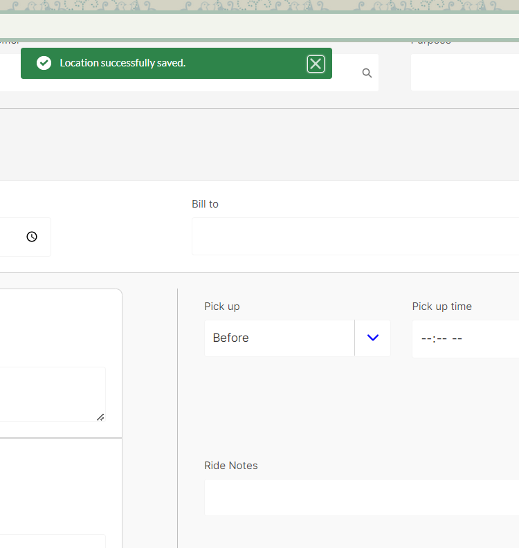 Save the address, and you will see a green box showing that it has been successfully added. The pop-up will close and then you will return to the Add a Ride Screen.