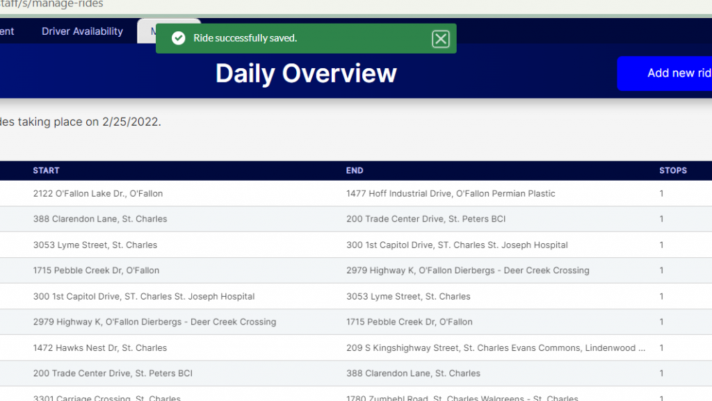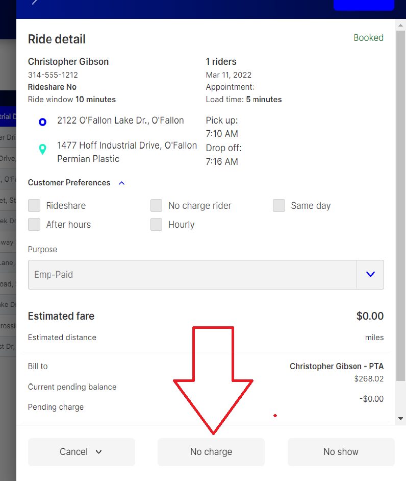 The ride record drawer will open, displaying all the ride details. Click the “No Charge” button at the bottom of the drawer. The ride will automatically save and the drawer will close. You will see the green “Ride Successfully Saved” message at the top of the screen.