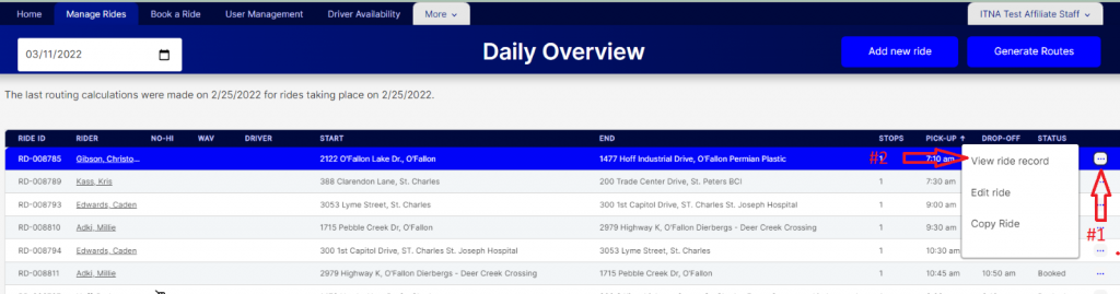 Locate the ride on the Daily Overview (Manage Rides Tab). Click on the three dots at the end of the line, and select “View ride record”.