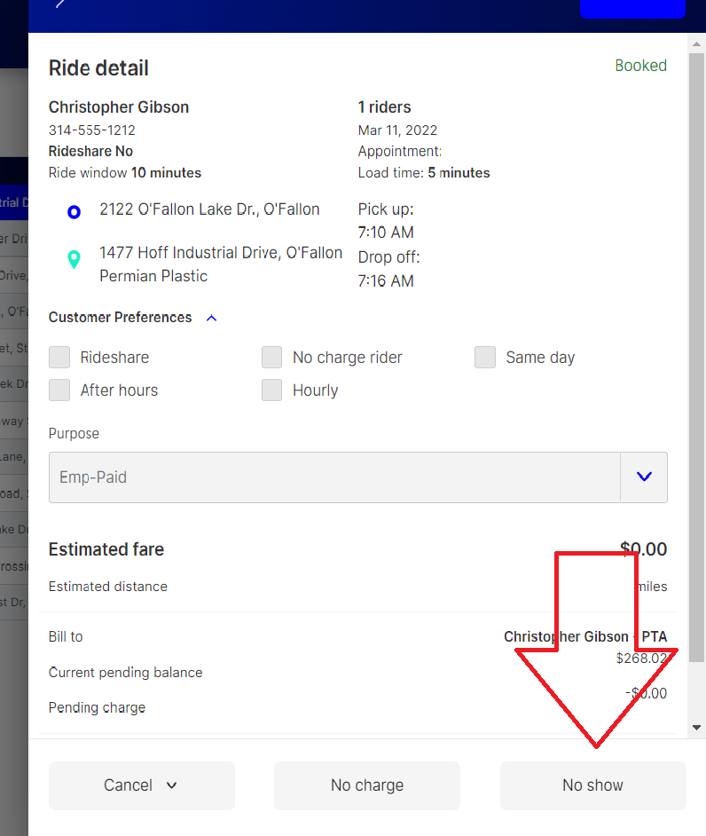 The ride record drawer will open, displaying all the ride details. Click the “No Show” button at the bottom of the drawer. The ride will automatically save and the drawer will close. You will see the green “Ride Successfully Saved” message at the top of the screen.