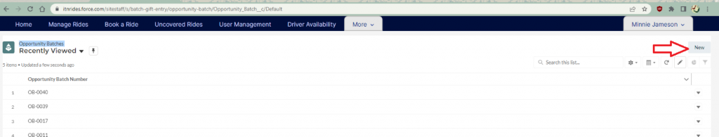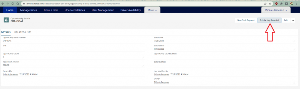 Total up the scholarships you will be awarding, and create an Opportunity Batch for that amount by clicking on More>Batch Check Entry.