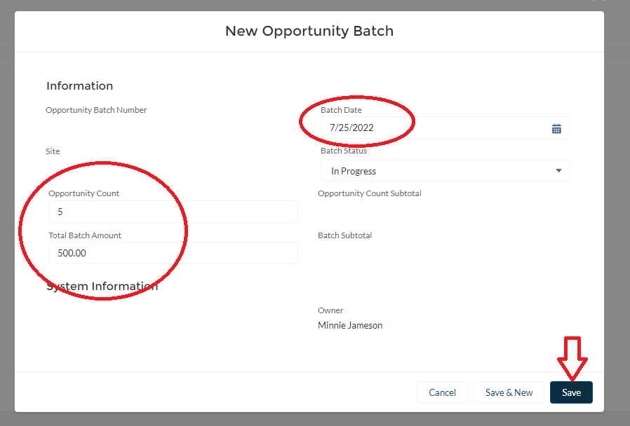 Enter the Batch Date, Opportunity Count (the # of scholarships to be awarded), and the Total Batch Amount (the total of all of the scholarships being awarded). Then click Save to create the batch.