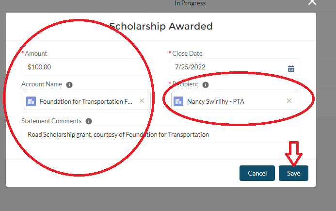 For each scholarship you are awarding, fill in the amount, the Account Name (which scholarship fund the scholarship is coming from), and the Recipient (who is getting the scholarship).  You can also fill in the Statement Comments with whatever you would like to have appear on the customer’s statement. Then Save.