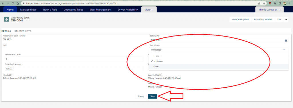 Repeat Steps 4 and 5 for each scholarship you are awarding, and then change the status of the Opportunity Batch to Closed and Save.