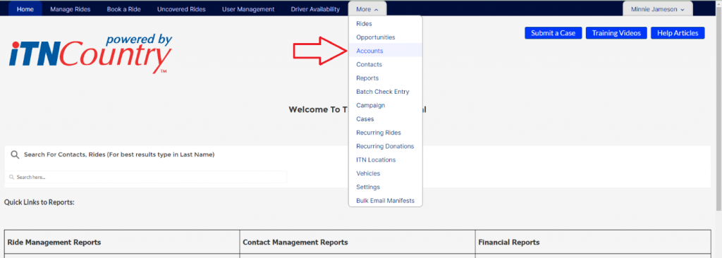 To view the monthly posting report, navigate to the site’s account page. Under the More menu, click on Accounts.