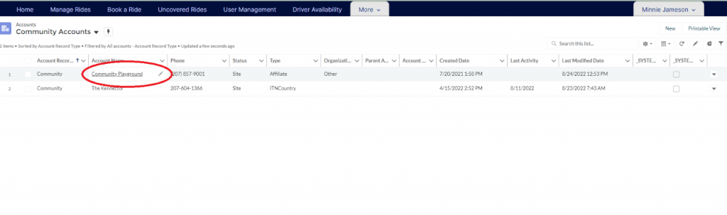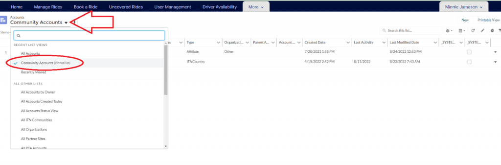 On the Accounts list page, choose the Community Accounts view if it is not the default.