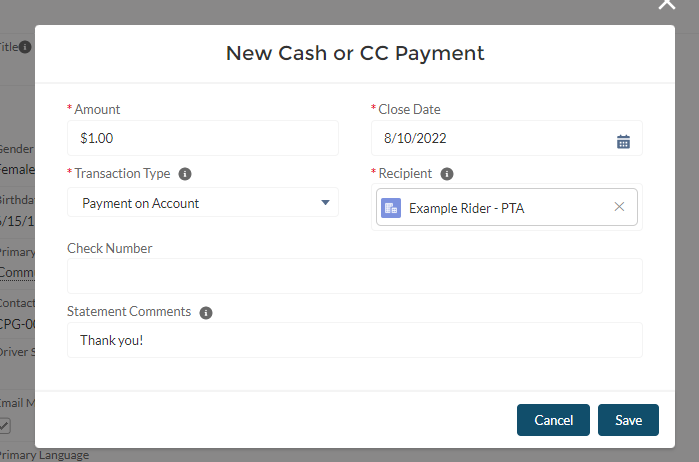Complete the form that shows up in the pop-up with the information for the payment. Anything you enter in the “Statement Comments” field will show up on the rider’s next monthly statement.