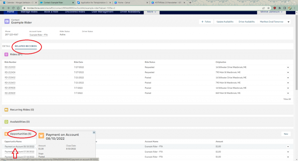 Next, you want to open the opportunity that was created, and process the payment.  Click on “Related Records” and scroll down to Opportunities.  The payment you just created should be the first one listed there.