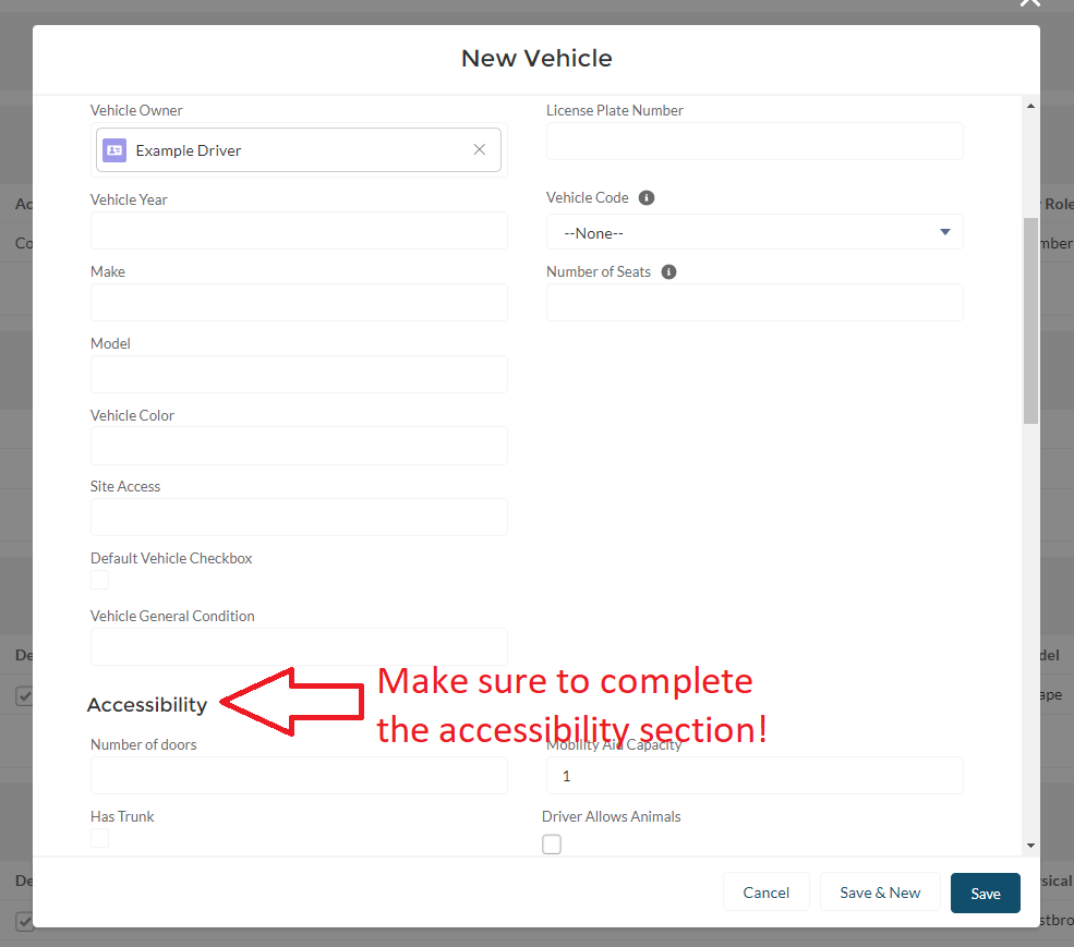Complete the form with as much information as you have, be sure to complete the Accessibility section to ensure correct matching when creating routes. Be sure to check full-size vehicle if the vehicle could comfortably sit a larger person. (Many riders check off they need a full size vehicle and this must be checked on the car to be able to match the driver with the rider). Not all fields are required, and some programs may not use sections tracking things like car maintenance.