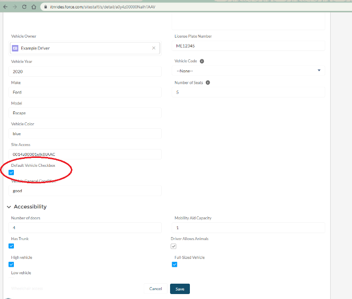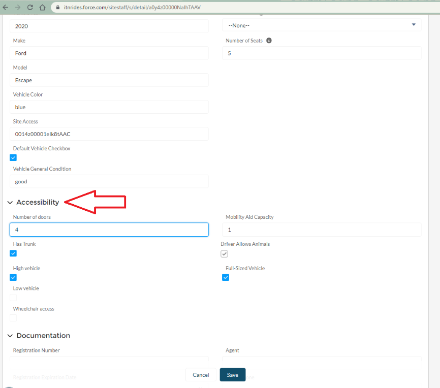 If a vehicle was entered when the application was submitted, click on the vehicle to open the record and scroll down to the Accessibility section to fill in the information necessary for generating routes. Be sure to check full-size vehicle if the vehicle could comfortably sit a larger person. (Many riders check off they need a full size vehicle and this must be checked on the car to be able to match the driver with the rider).