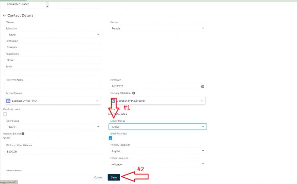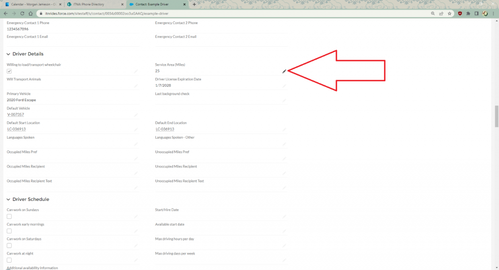 Once you have opened the Driver Contact page, scroll down to the “Driver Details” section and click on the pencil next to Service Area (Miles). This will open the entire page for editing. Enter the number of miles the driver is willing to drive (from their own address) in this field. The system will only allow drivers to be assigned to rides within this distance from their address.
