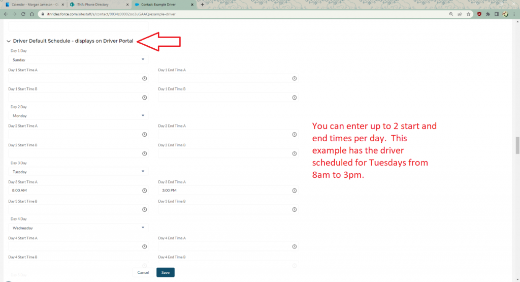 Scroll down to the section of the page that says “Driver Default Schedule- displays on Driver Portal”. In this section, enter the regular weekly schedule for the volunteer. You can enter up to two time slots for each day of the week. Click Save.