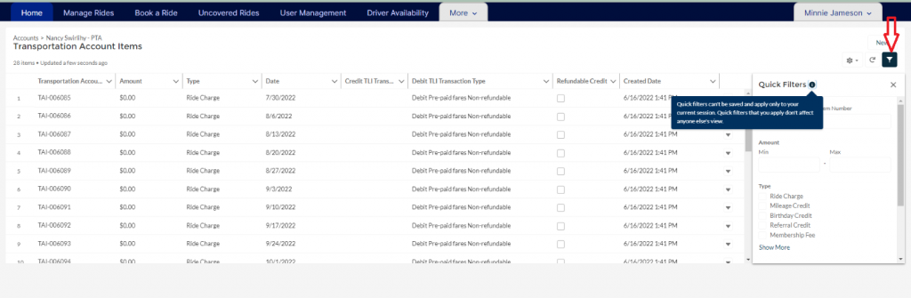 Click on the filter to filter by transaction type.