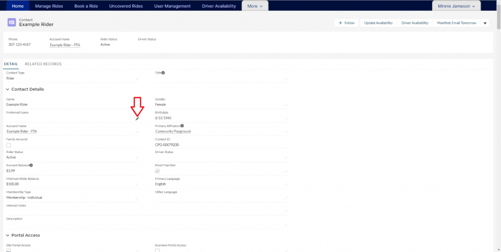 The Contact Record page lists all the information about the rider, and you can edit any field that has a little pencil graphic next to it. (The pencils are grayed out until you hover over them, so they can be hard to see at first).